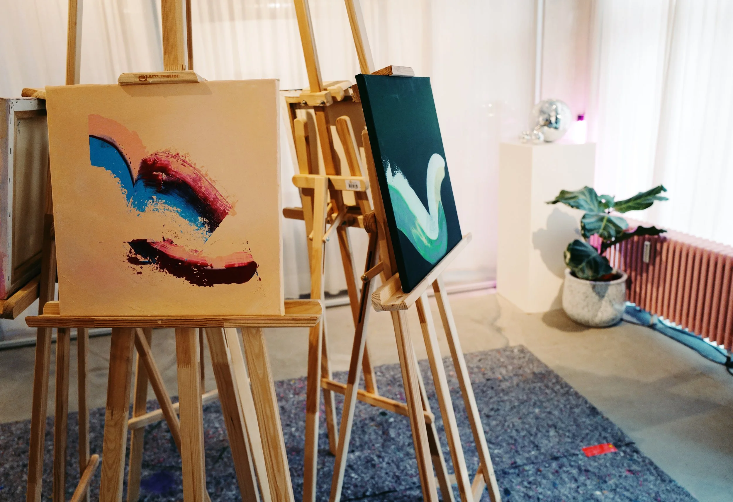Ich komme dorthin, wo ihr lebt, arbeitet oder feiert – und schaffe temporäre Räume für kreatives Schaffen und Austausch. Während ihr euch kreativ fallen lassen könnt, denke ich an alles: Farben, Pinsel, Papier oder Leinwände, Schutzmaterialien und Inspiration.
