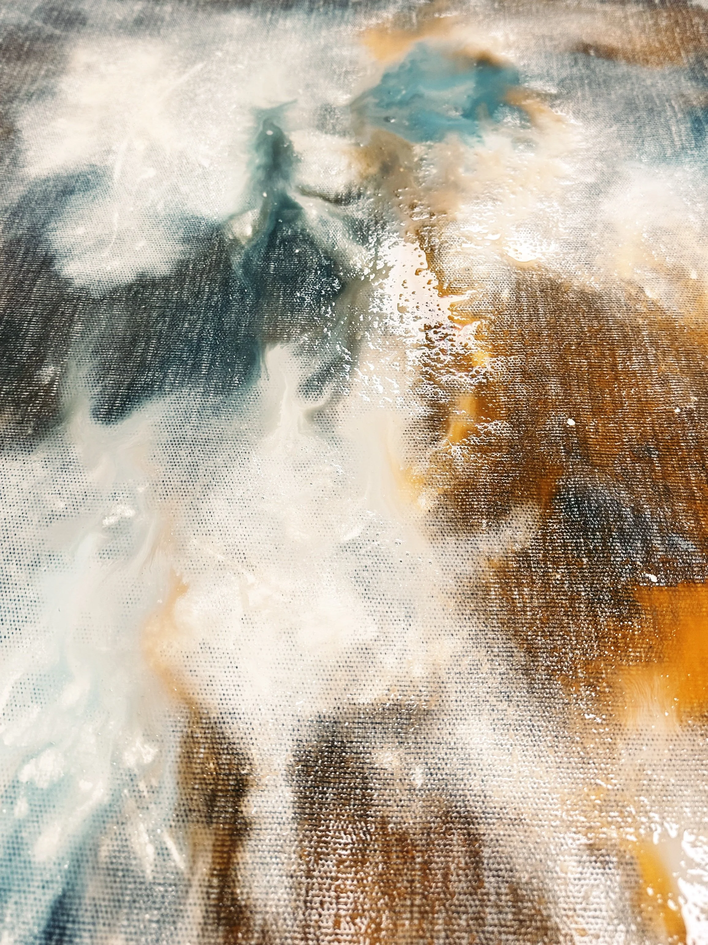 Vor dir wird ein Stück Canvas liegen. Wähle zwischen Natur- oder weißem Canvas. Du schüttest, tropfst und streichst mit wasserverdünnter Farbe oder Farbpigmenten direkt auf das Canvas. Dieser Vorgang kann mehrmals wiederholt werden.